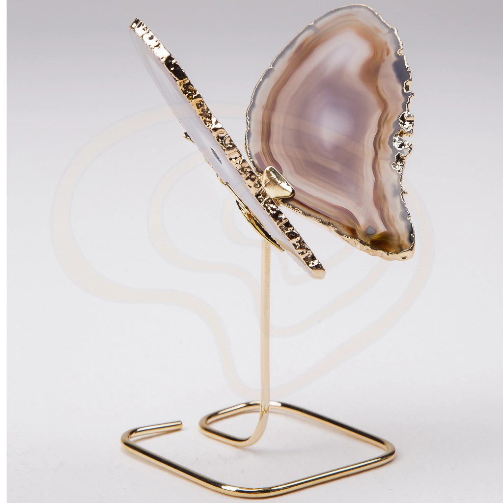 Encante seus ambientes com a elegância natural da Borboleta em Ágata Natural com Base. Essa peça delicada une o brilho e as cores únicas da ágata à leveza do design em formato de borboleta suspensa, sustentada por uma base em metal folheado a ouro. Símbolo de transformação e equilíbrio, é ideal para quem deseja decorar com exclusividade e significado, agregando beleza, natureza e requinte à decoração.