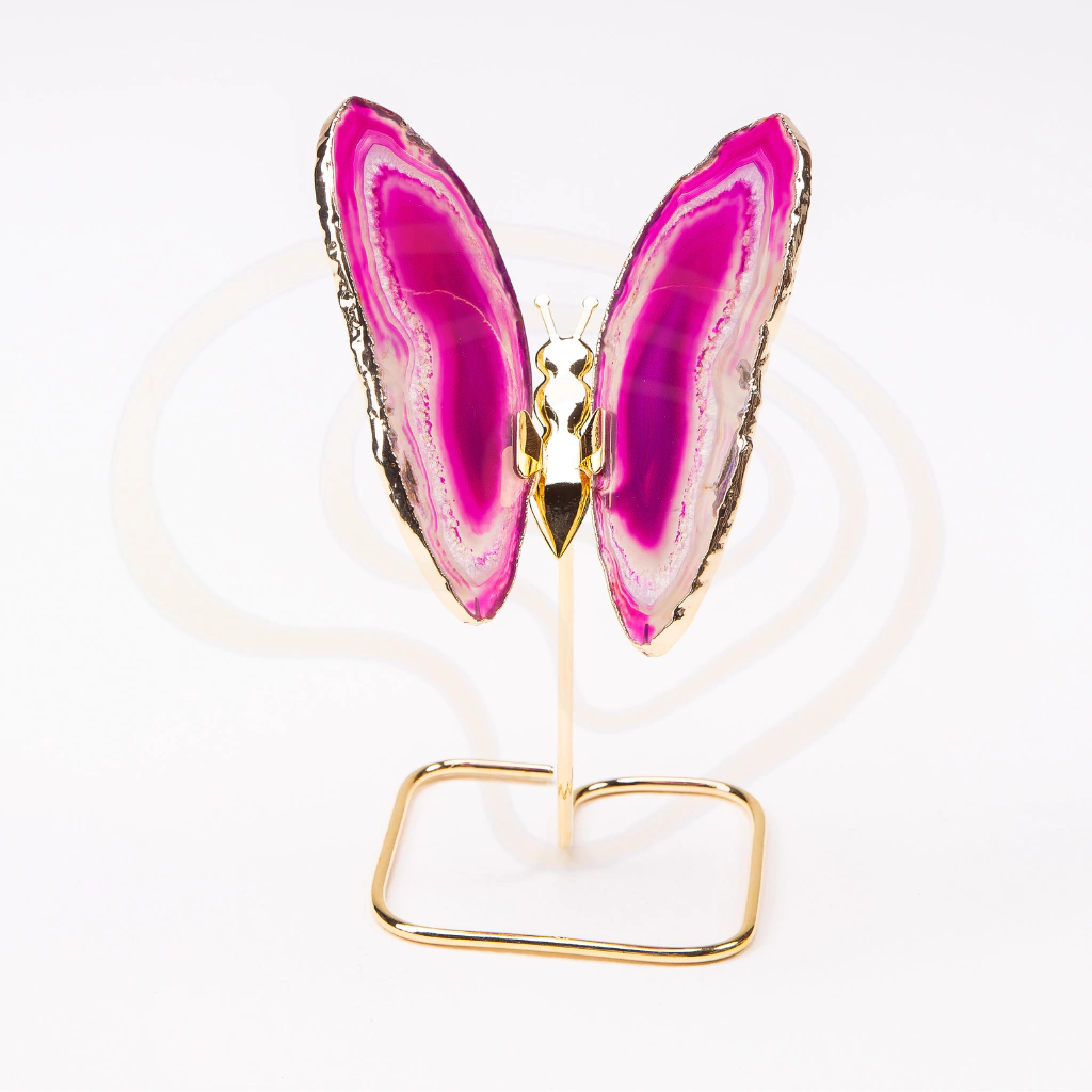 A Borboleta em Ágata Rosa com Base é um símbolo de amor, transformação e leveza. Esculpida a partir de ágata natural e finalizada com bordas e base folheadas a ouro, esta peça encanta pela sua beleza romântica e energia acolhedora. Ideal para compor ambientes elegantes e transmitir serenidade e ternura com um toque refinado.