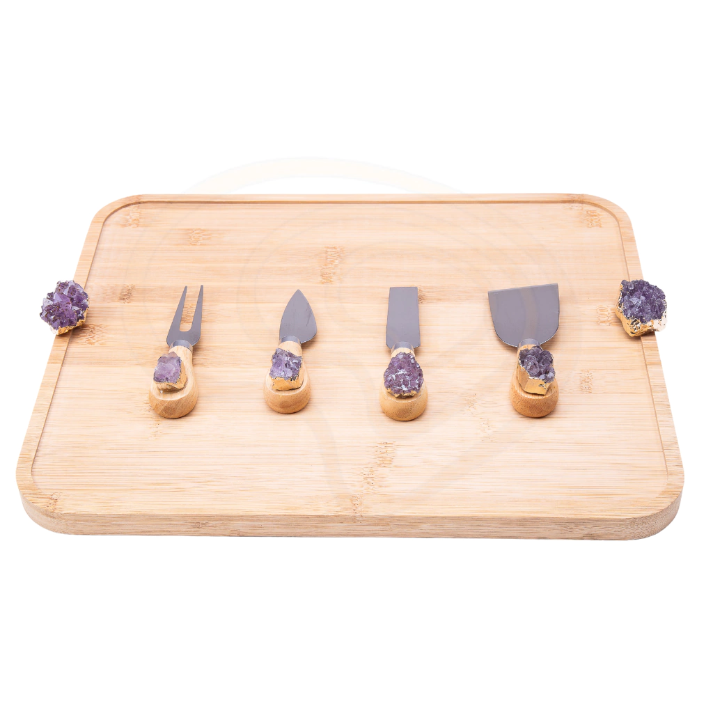 Transforme suas experiências gastronômicas com o Kit Queijo de Bambu com Drusa de Ametista. Uma combinação perfeita entre a naturalidade do bambu e a beleza mística da ametista, com acabamento folheado a ouro 24k. Este conjunto de 4 peças une elegância, resistência e um design que eleva qualquer ocasião, seja para receber convidados ou presentear alguém especial.