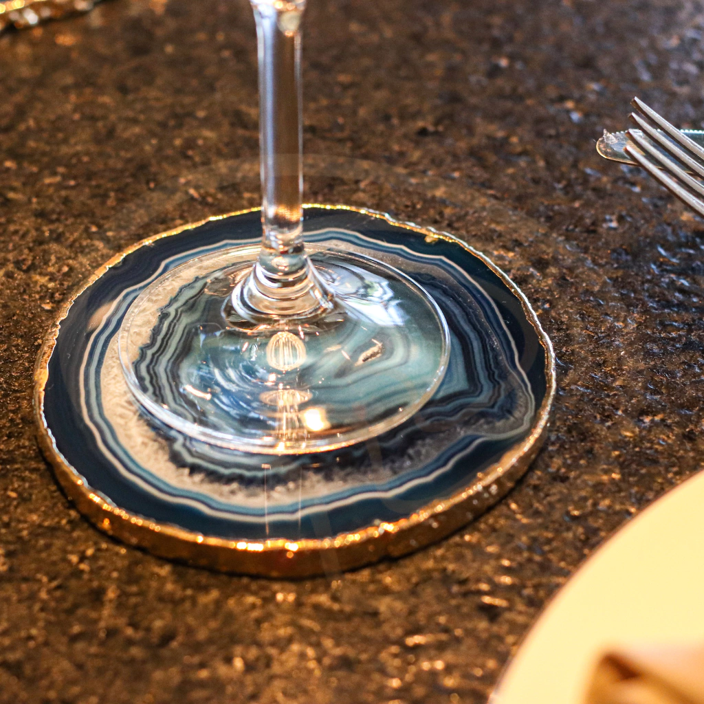 Adicione um toque de sofisticação e frescor à sua mesa com o Porta Copo em Ágata Azul. Esta peça refinada combina a profundidade da ágata azul com a riqueza do acabamento em ouro 24k, resultando em um acessório elegante e funcional para seu espaço.