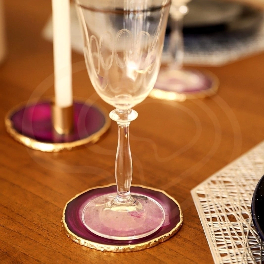 Adicione um toque de charme e elegância à sua mesa com o Porta Copo em Ágata Rosa. Esta peça única combina a beleza delicada da ágata rosa com um acabamento luxuoso em ouro 24k, criando um acessório sofisticado e funcional para seu ambiente.