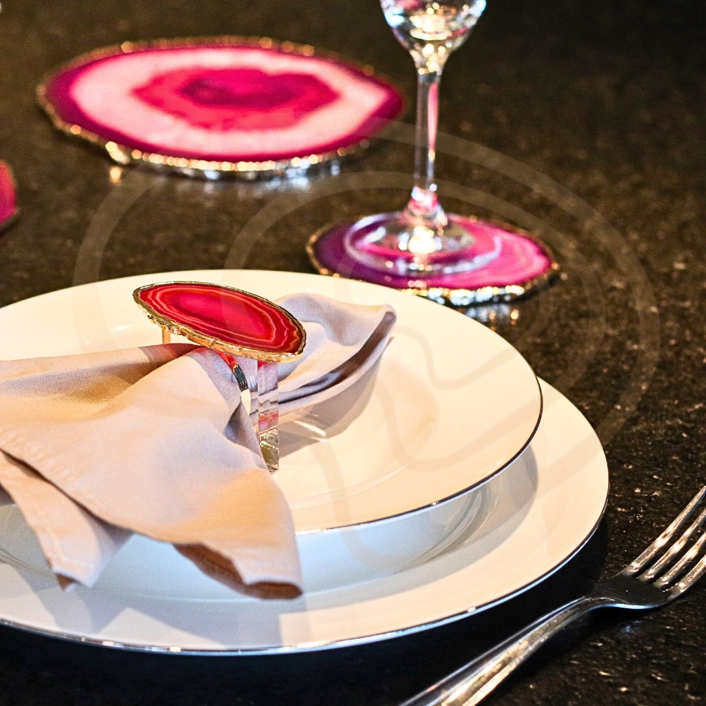 Adicione um toque de charme e elegância à sua mesa com o Porta Guardanapos em Ágata Rosa. Este acessório exclusivo une a suavidade da pedra natural com a leveza do acrílico e o brilho da borda folheada a ouro, criando uma composição perfeita para encantar em qualquer ocasião.
