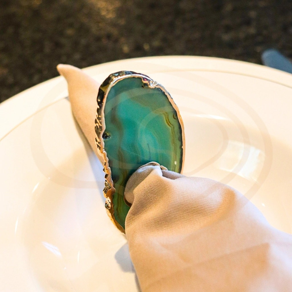 Adicione um toque de serenidade e sofisticação à sua mesa com o Porta Guardanapos em Ágata Verde com Furo. Este item une o charme da pedra natural à nobreza do acabamento dourado, criando uma peça funcional e visualmente encantadora.
